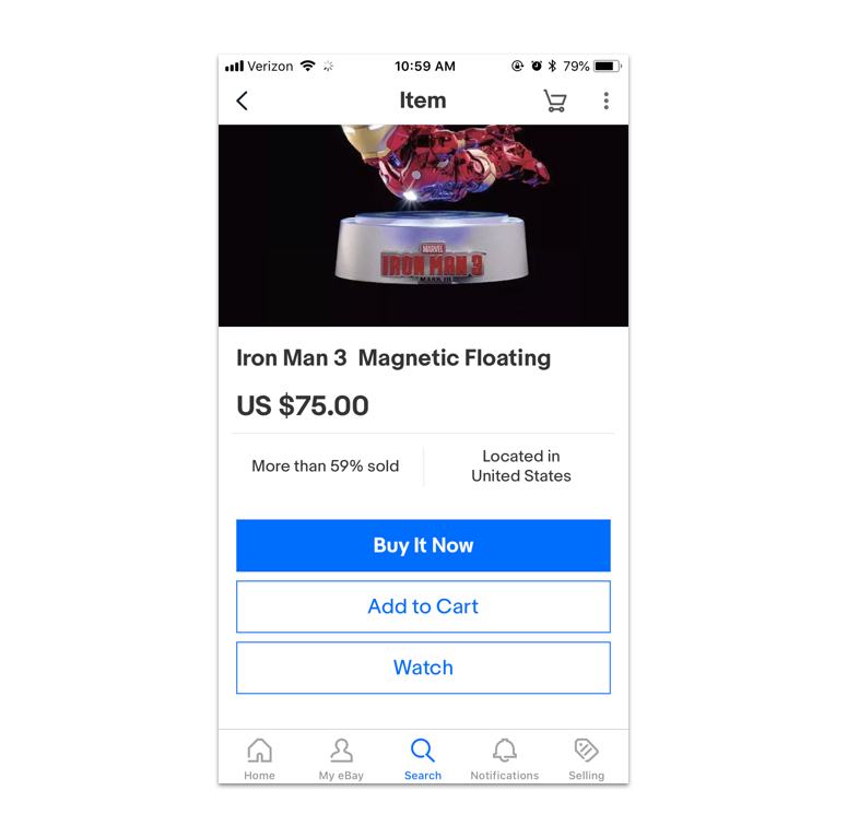 Step 1: A user opens the eBay app to find an item they want. They immediately search for the item, find it, and decide to buy it.