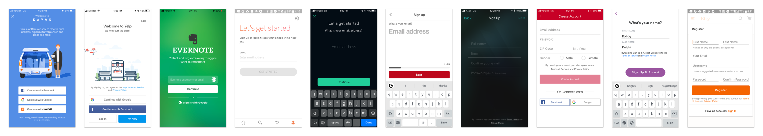 Competitive Analysis. At the start of this project, I created dozens of accounts and collected over a hundred account creation pages for different sites and services, because it was important to re-contextualize myself with the various solutions that exist in the marketplace.