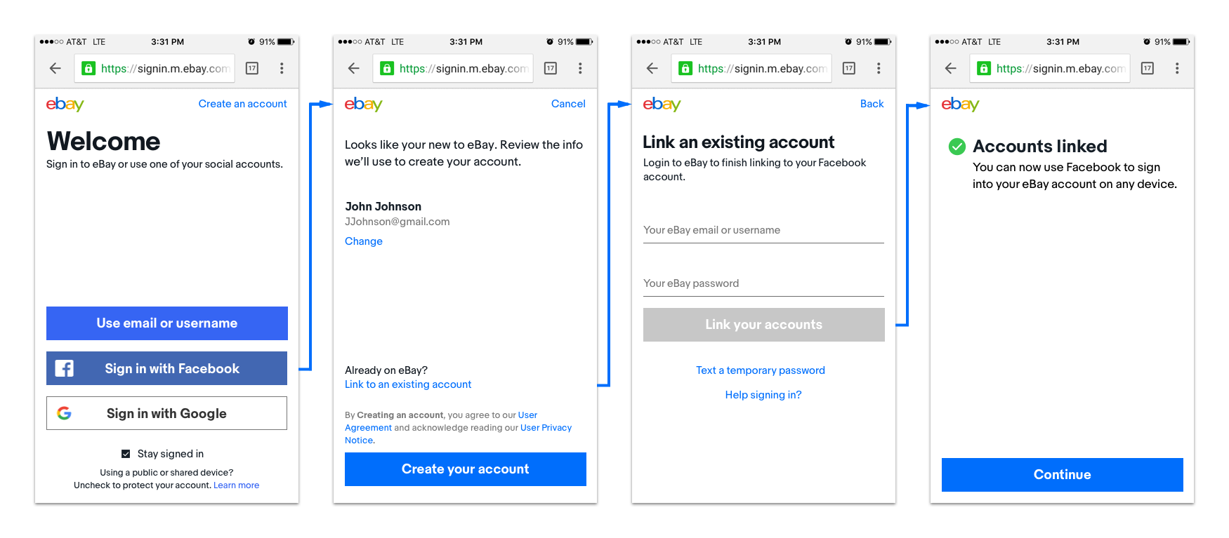 Users want to register without having to create a new account and remember another password. The problem is that eBay is gated. That means that when users want to buy or sell something, amongst other tasks, they have to enter personal information, which causes friction and, therefore, drop off. Though eBay is not currently in a place where they can remove the gate, it can definitely be made simpler and more familiar in order to meet marketplace standards.